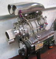 7.5:1 compressions ratio, forged pistons, crane blower and camshaft, dart iron eagle heads, with 220cc inlet runners and 76 cc combustion chambers. Supercharger is a GMC 6/71 producing 10psi of boost. On top of this are 2 600 CFM hollys and a polished shotgun scoop. This engine produced in the region of 500 bhp, and is fitted in a 78 camro.